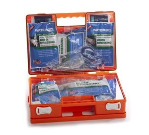 Kofferten inneholder Water-Jel-brannbandasjer i ulike størrelser. Felles for disse er at de er beregnet på større brannskader. De finnes i størrelsene 10x10 cm, 10x40 cm, 20x55 cm (beregnet på hender) og 40x30 cm (beregnet på ansikt). Du får også med gasbind, universalbind, sterile kompress, plastertape, sterile hansker og sårvaskeservietter.